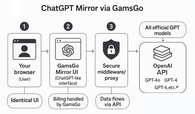 La troisième option offre Gamsgo est quelque chose appeléMiroir de chatppt. Celui-ci est un peu différent - vous ne vous connectez pas du tout à un compte officiel Chatgpt. Au lieu de cela, GAMSGO vous fournit une interface Web spéciale qui «reflète» le chatppt officiel, avec GPT-5 et toutes les fonctionnalités plus. Vous y accédez via le site de Gamsgo (ou un lien fourni) avec votre compte Gamsgo, et cela fonctionne comme Chatgpt - mais à un coût encore plus faible par mois.