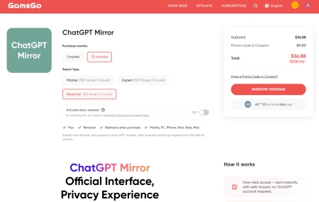 Avantages:Le plus grand pro ici estEffectif combiné avec la vie privée. Cette option était encore moins chère par mois que le compte partagé. Au moment de la rédaction du présent3,68 $ / mois(contre 20 $ officiellement). C'est incroyablement bon marché, car vous obtenez toujours tous les avantages. Et comme vous ne partagez l'environnement avec personne, vous n'avez les problèmes de confidentialité du compte partagé. Un autre avantage: pas du tout besoin d'un compte Openai - ce qui est génial si vous aviez du mal à en créer un ou si vous obtenez le paiement du côté d'Openai. C'est essentiellement plug-and-play; Gamsgo fournit le service directement dans votre navigateur en un seul clic.