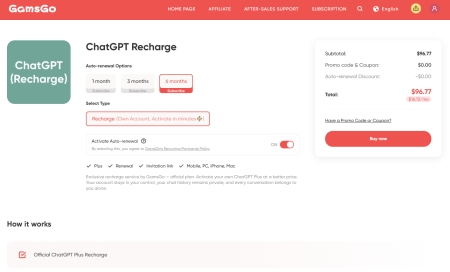 La deuxième option de Gamsgo est d'acheter unCompte Chatgpt plus partagéà un coût mensuel beaucoup plus bas. Essentiellement, Gamsgo créera ou fournira un compte ChatGpt Plus qui est partagé entre un petit groupe de clients. En divisant un abonnement entre plusieurs personnes, chaque personne ne paie qu'une fraction du prix. Par exemple, au lieu de 20 $, vous pourriez payer sur la commande de 5 $ à 6 $ par mois pour les mêmes fonctionnalités.